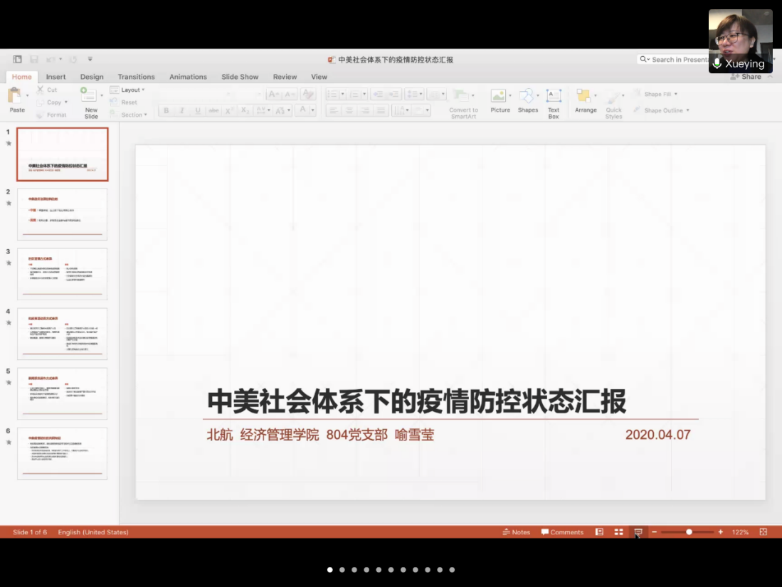 正在美国交流访问的喻雪莹副教授从社区管理、抗疫资源动员、新闻系统运作等方面分享了中美疫情防控工作的差异。她谈到,2月份的时候,看到国内新闻里,全国医疗工作者集结武汉,令她热泪盈眶;3月份的时候,看到武汉人民欢送这些白衣天使,再次令她动容。他们是最美的逆行者,他们为祖国人民的平安健康做出了巨大贡献。而自己向他们致敬的方式,就是原地坚守,静待花开,尽量圆满地完成访学任务,再以更大的热情投入到新的教学科研挑战中。