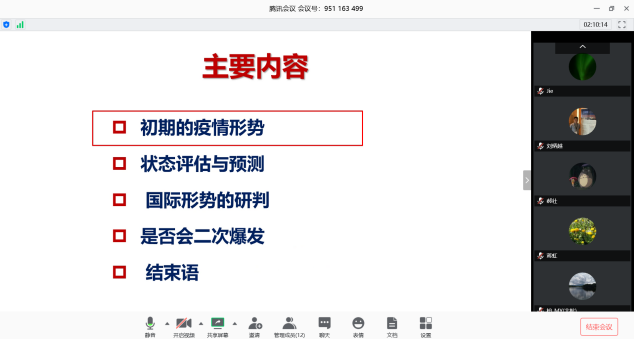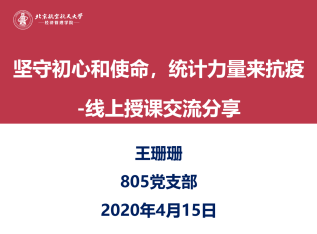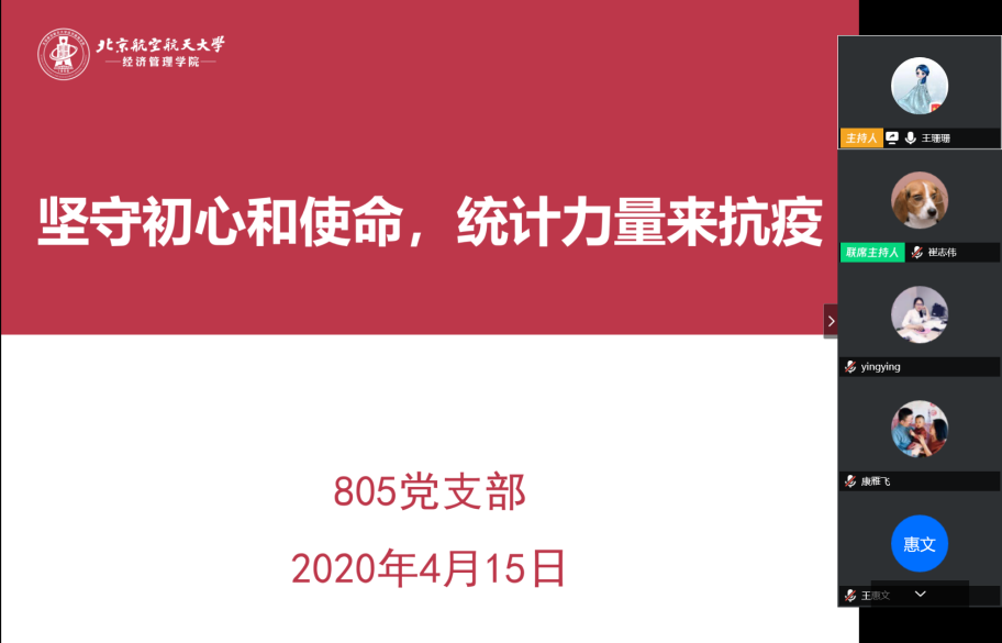 为了进一步学习和贯彻习近平总书记关于科学精准防控抗疫重要指示精神,落实教育部提出的“停课不停教、停课不停学”要求,beat365亚洲版官网805党支部于2020年4月15日下午15:00-17:00利用腾讯会议开展了题为“坚守初心和使命,统计力量来抗疫”主题党日“云”活动。805支部成员和805系其他非党员老师均参加了此次活动。