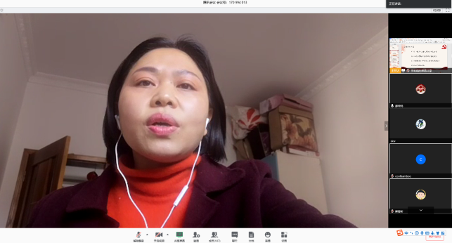 本次主题党日邀请了学院本科生廖珅的母亲分享其作为湖北医护人员在疫情期间的经历和感受。曾护士长分享了她作为眼科护士长在疫情期间所承担的主要工作,所面临的一些困难,接着讲述了党和政府对湖北地区提供的及时的支援和救助,之后生动具体地向我们描述了她在疫情期间具体的工作内容以及一些感人经历,以小见大地反映了所有的医护人员在整个疫情期间所付出的巨大努力,在抗击疫情时的万众一心。2016级本科生赵建霞和冯博佳分享作为留学交换归国学生的经历。两位本科生对自己在比利时的经历和整个回国的过程做了分享,并讲述了在整个归国的过程中,所切身体会到的国内对疫情防控相关工作的完备,以及国家所带来的安全感,表达了对祖国的热爱和自豪。学院2017级本科生吴祁颖同学分享了他参与疫情研究相关工作的经历。在疫情防控期间,吴祁颖参与王惠文教授的科研团队工作,利用数据分析监控全国地区的疫情发展情况,撰写提案,通过民建等组织提交,其中《关于考虑分期、分批恢复全国各地社会经济活动的建议》被民建中央采用,展现了当代大学生的心系祖国、心系人民的责任与担当。