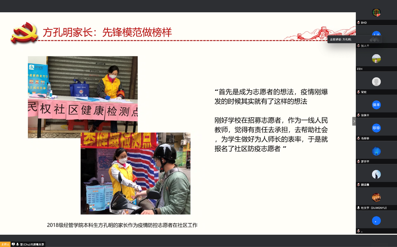 2020年4月10日,由beat365亚洲版官网803党支部主办,802党支部协办,联合举行“科学防疫、共待春来”系列在线主题党日活动第一期,邀请四位在抗疫一线的医护人员、家长、学生、青年教师分享自己的志愿经历,803支部副书记张楚主持会议。