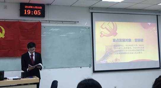 拟发展对象雷颖建宣读《入党志愿书》,讲述他对党组织和党员先进性的认识,汇报了自己思想和行动上向党组织靠拢的努力,表达了渴望早日通过组织考察、加入中国共产党的愿望,同时也深入剖析了自己在主观能动性等方面的不足,针对做事拖沓等问题提出了具体的改进措施,他表示今后仍会不断提升理论和实践水平,积极向组织靠拢。雷颖建同志的两位培养联系人分别向支部汇报了关于雷颖建同志的培养考察情况,对雷颖建同志的优缺点进行了客观的分析并提出了改进意见,他们一致认为雷颖建同志基本符合发展为预备党员的条件,并希望在今后的学习生活中,他能够坚持以党员的标准严格要求自己,早日成为一名优秀学生党员。