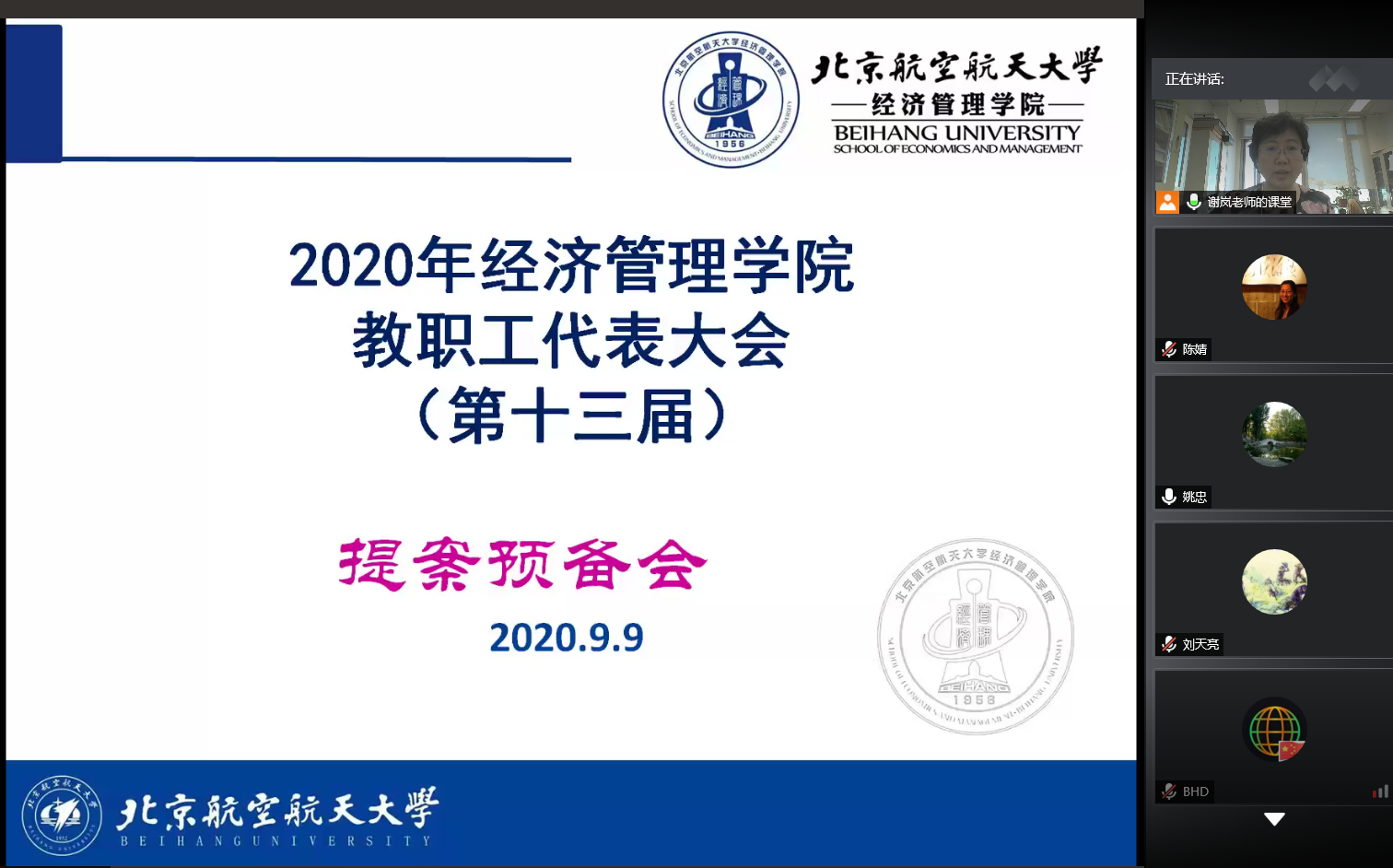 2020年9月9日中午,经管学院通过腾讯会议的形式召开了第十三届教职工代表大会提案预备会议。学院工会主席谢岚就教代会相关文件、提案征集方法和渠道进行了介绍和部署,共有三十余名教代会代表参加了此次会议。