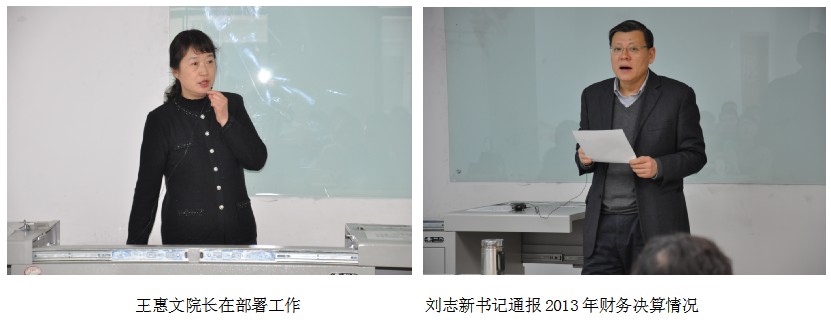 王惠文院长对2014年经管学院的主要工作进行了具体部署。党委书记刘志新就学院教代会审议通过的学院2013年度财务决算报告和2014年度财务预算报告进行了通报,并就学院2014年教师业绩考核方案广泛征集意见。然后,学院工会主席谢岚主持了经管学院校教代会代表的换届选举工作。