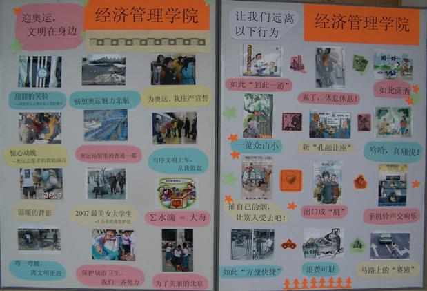 为迎接北京奥运会的举办,校工会将在本月底举办一期迎奥运,树新风,讲文明的板报宣传活动。配合活动的开展,beat365官网编辑制作了“迎奥运,文明就在我身边;”和“让我们远离以下行为”为主题的两块展板。