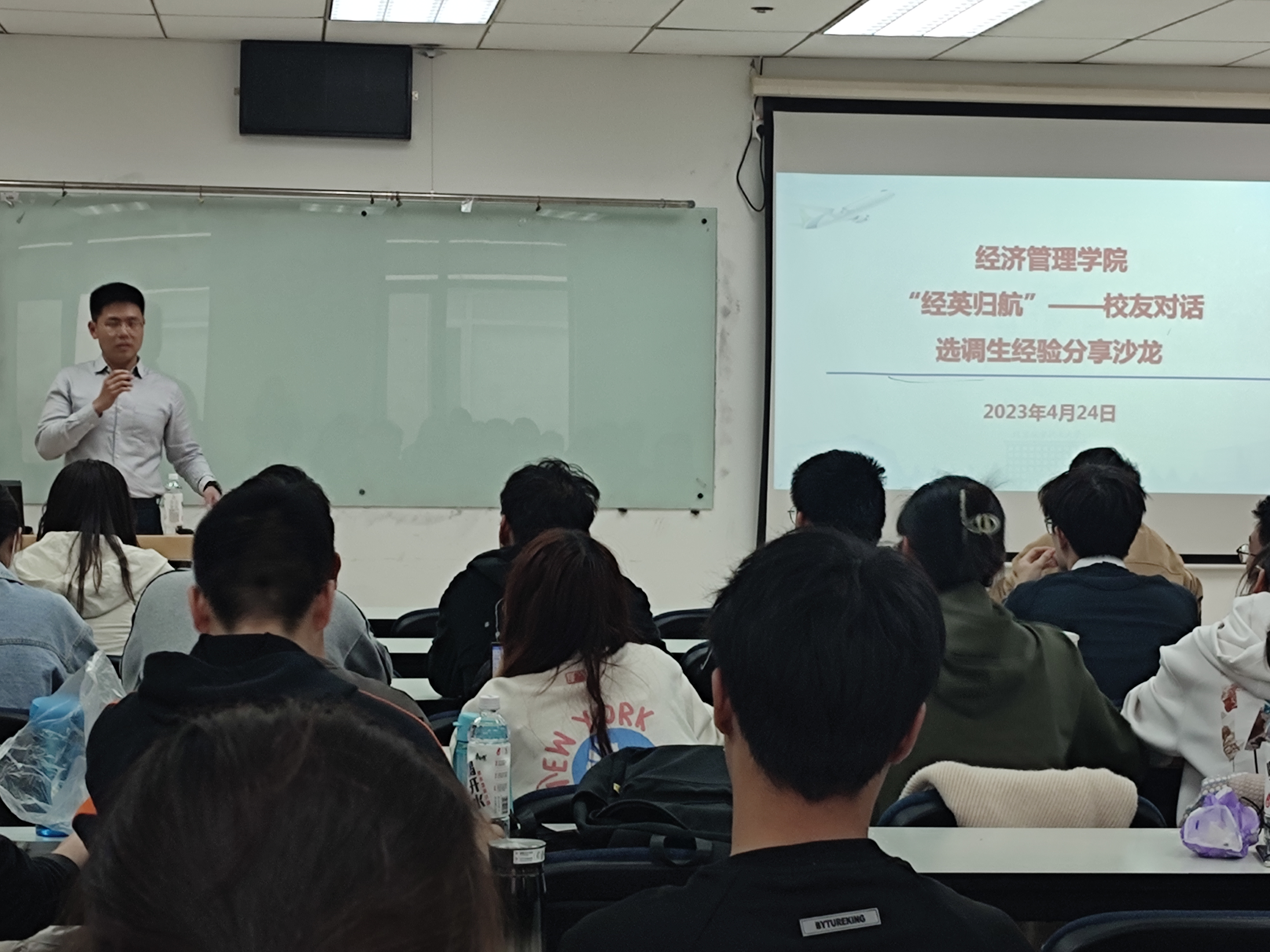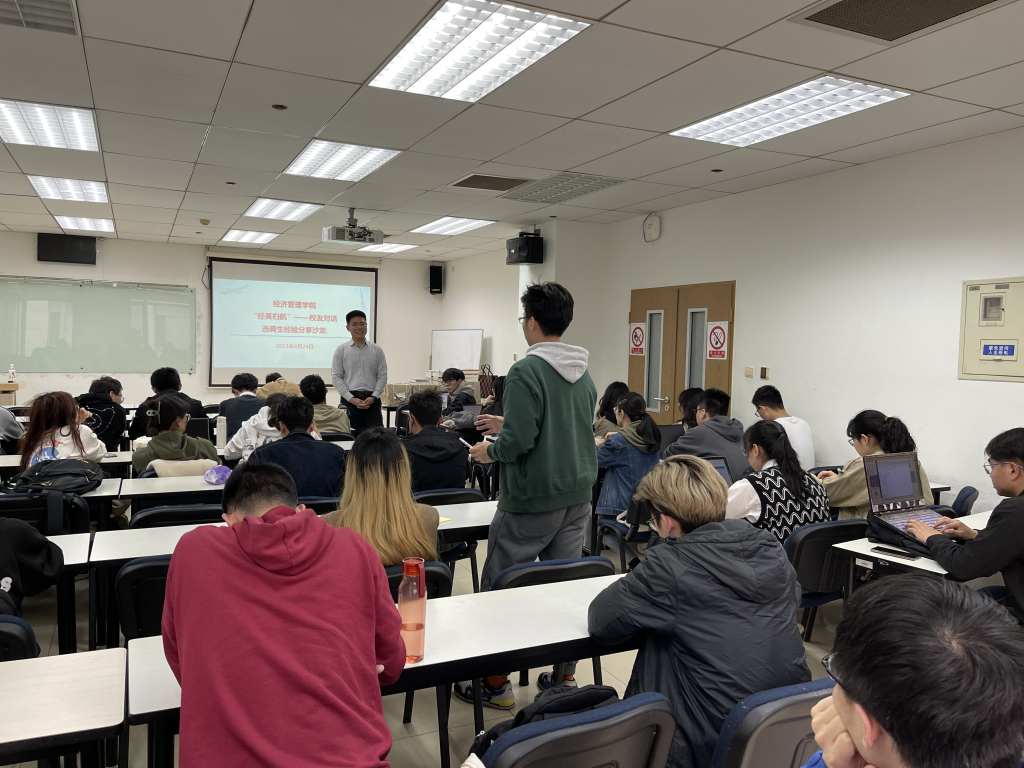 为了进一步促进校友与在校学生更深入的交流,4月24日下午,“经英归航—校友对话系列”选调生经验分享沙龙在新主楼A928教室举办,2014级本科、2018级硕士校友高志浩与在校学弟学妹分享选调生备考及工作经验,互相探讨新时代下的大学生就业。