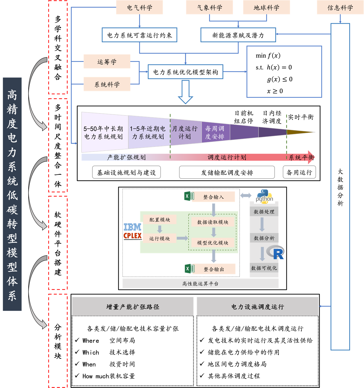 综合运用电气科学、运筹学、系统科学、信息科学等多学科方法,将中长期与短期多时间尺度的电力系统供需平衡进行整合,构建了实现我国高精度低碳电力系统优化分析的方法模型体系。