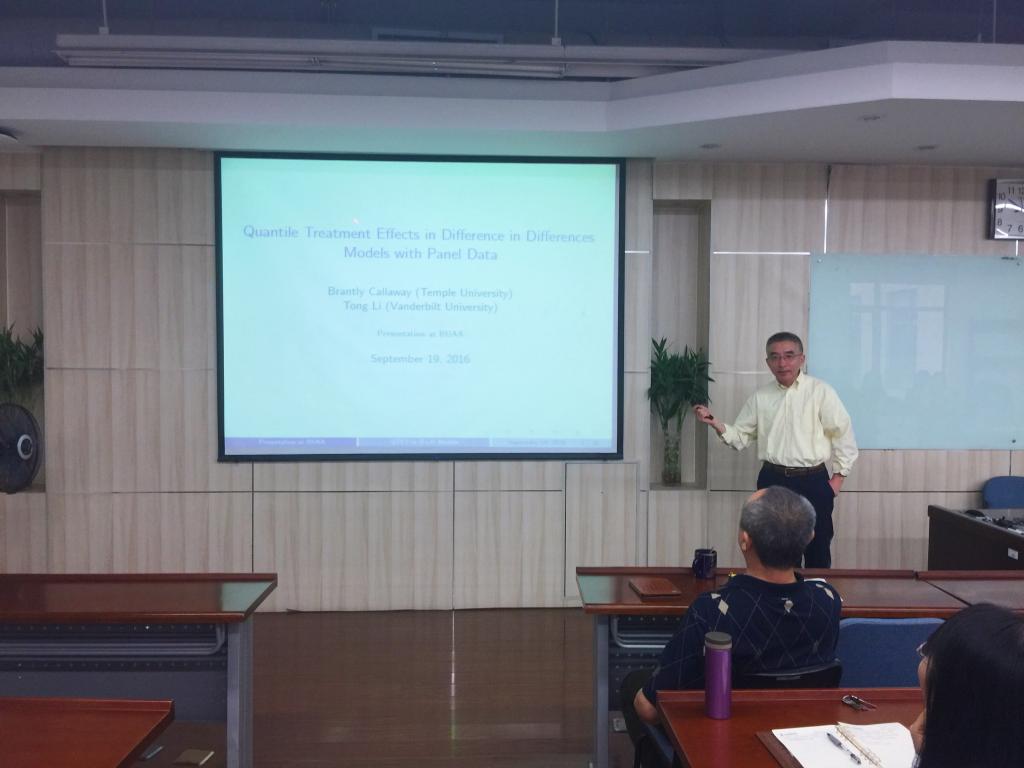 2016年9月19日上午,美国范德堡大学李彤教授来访,做了题为“Quantile Treatment Effects in Difference in Differences Models with Panel Data”的学术报告。韩立岩教授主持了报告。
