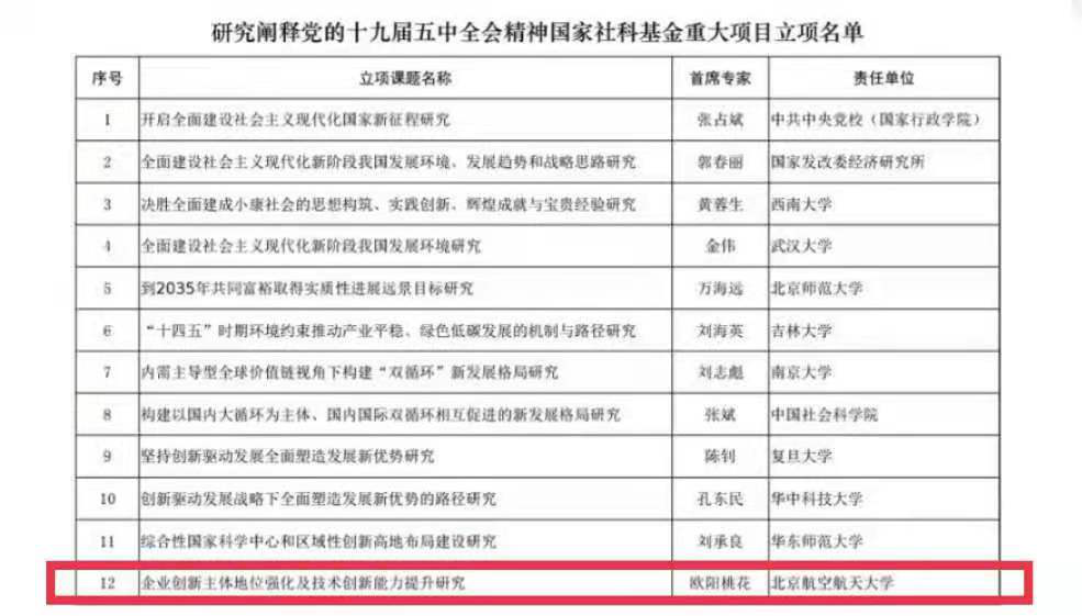 “研究阐释党的十九届五中全会精神”国家社科基金重大项目立项名单正式公布,beat365亚洲版官网共有1项入选,即经管学院欧阳桃花教授团队的课题“企业创新主体地位强化及技术创新能力提升研究”。这是我校国家社科重大项目立项取得的又一次重要突破。