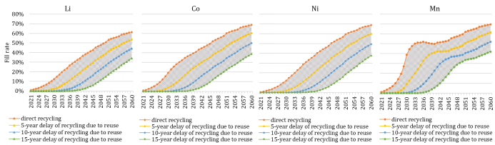 长期来看,通过DSPV+RBESS模式构建起电池回收体系对于退役电池内主要金属元素的回收意义重大。根据动力电池的二次寿命及参与梯次利用的规模占比,动力电池自退役期始,其主要金属元素的再生过程会存在0~15年的滞后期。研究根据未来电动汽车增长规模与电池技术的假定,计算了从退役电池再生的金属元素占新电池生产需求中的比重情况,结果显示,到2060年,在新电池生产过程中可以有33.9%~61.6%的Li,38.8%~69.0%的Co,37.6%~68.7%的Ni和42.1%~69.8%的Mn来自于退役电池中的再生元素,因此退役电池回收利用体系对于资源可持续利用具有重要意义。