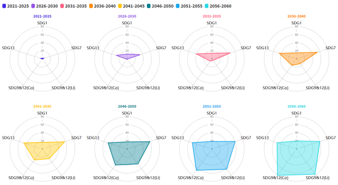 ● 长期(2041~2060年):在这一时期,退役电池规模将远超过农村居民部门DSPV+RBESS的需求,仅有约不到15%的退役电池可被用于DSPV+RBESS。退役电池回收利用体系对SDG9和SDG12的贡献较大,从退役电池中再生的Li资源可以达到0.2~9.5万吨/年,Co资源可以达到0.3~9.9万吨/年。