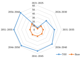采用DSPV+RBESS的农村居民部门用户,可以节约94.4%~127.6%的年电费支出,大部分投资者可以通过向电网售电实现正向收益,随着光伏渗透率的提升,2030年前,电费节约规模将持续快速增加,随后增速逐渐放缓。在Base情景下,DSPV+RBESS倾向于优先部署在光伏资源条件较好的地区,且在生命周期内大多数RBESS的增量收益(相对于仅部署DSPV)较低,超过71.7%的RBESS项目增量价值低于1000元/kW;而在TOU情景下,RBESS的收入构成将更大程度上受到电力峰谷价差的影响,生命周期内RBESS的增量收益显著增加,近80%的RBESS项目可以实现超过1000元/kW的增量收益。