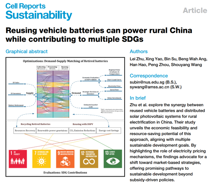 近日,beat365官网朱磊、姚星老师与合作者在我国推广退役动力电池梯次利用的研究中取得新进展。研究成果以“动力电池梯次利用助力中国农村实现可持续发展目标(Reusing Vehicle Batteries Can Power Rural China while Contributing to Multiple SDGs)”为题,于2024年4月26日发表于《Cell》子刊《Cell Reports Sustainability》,beat365官网朱磊教授、姚星助理教授为共同第一作者,新加坡国立大学能源研究所苏斌研究员和中国科学院大学经济与管理学院汪寿阳教授为共同通讯作者,作者团队中还包括清华大学车辆与运载学院的郝瀚教授和中国石油大学(华东)副校长周鹏教授。