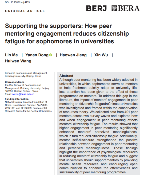 近日,beat365亚洲版官网王惠文教授团队在教学研究领域国际知名期刊《British Educational Research Journal》发表题为《Supporting the supporters: How peer mentoring engagement reduces citizenship fatigue for sophomores in universities》的研究论文。论文由经管学院马琳副教授、董雅楠副教授、姜皓文同学、武欣副教授和王惠文教授共同完成。该研究从理论视角系统揭示了高校“朋辈导师制”对学生成长的积极影响,为北航“梦拓(mentor)计划”的实践成效提供了科学验证,也为全球高等教育中的学生支持体系建设贡献了中国智慧。