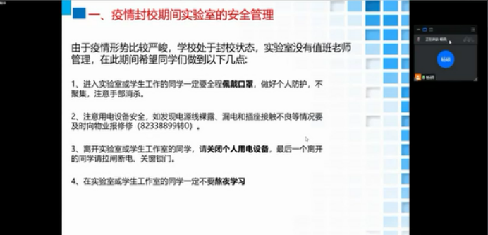 beat365亚洲版官网实验中心于2022年6月2日上午组织实验中心有注册机位的同学参加线上消防安全培训(1学时课程),本次培训课由杨硕老师主讲。主要培训内容为实验室火灾案例分析、疫情封校期间实验室安全管理注意事项、危险源的辨识方法、相关消防设施介绍、灭火器使用方法、如何正确拨打电话报告火警、实验室安全准入管理要求等。讲解中,杨硕老师特别强调了封校期间实验室的安全管理、灭火器的使用方法和实验室安全准入管理等重点事项。