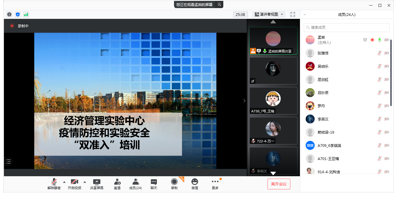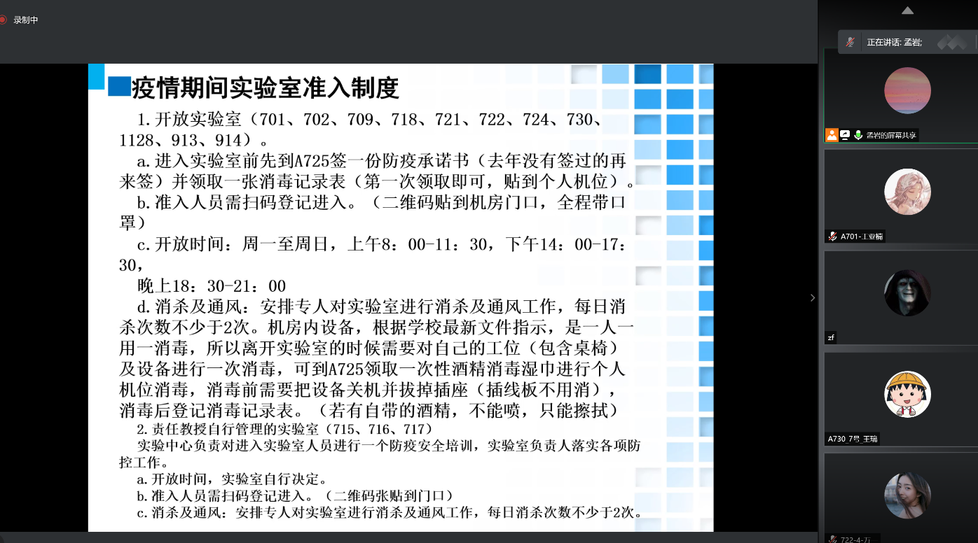 按照学校秋季学期实验室疫情防控工作的通知要求,beat365官网实验中心于2021年9月2日下午14点通过腾讯会议组织实验中心有注册机位的同学进行“疫情防控和实验安全”双准入培训。本次培训由实验中心杨硕老师主讲。