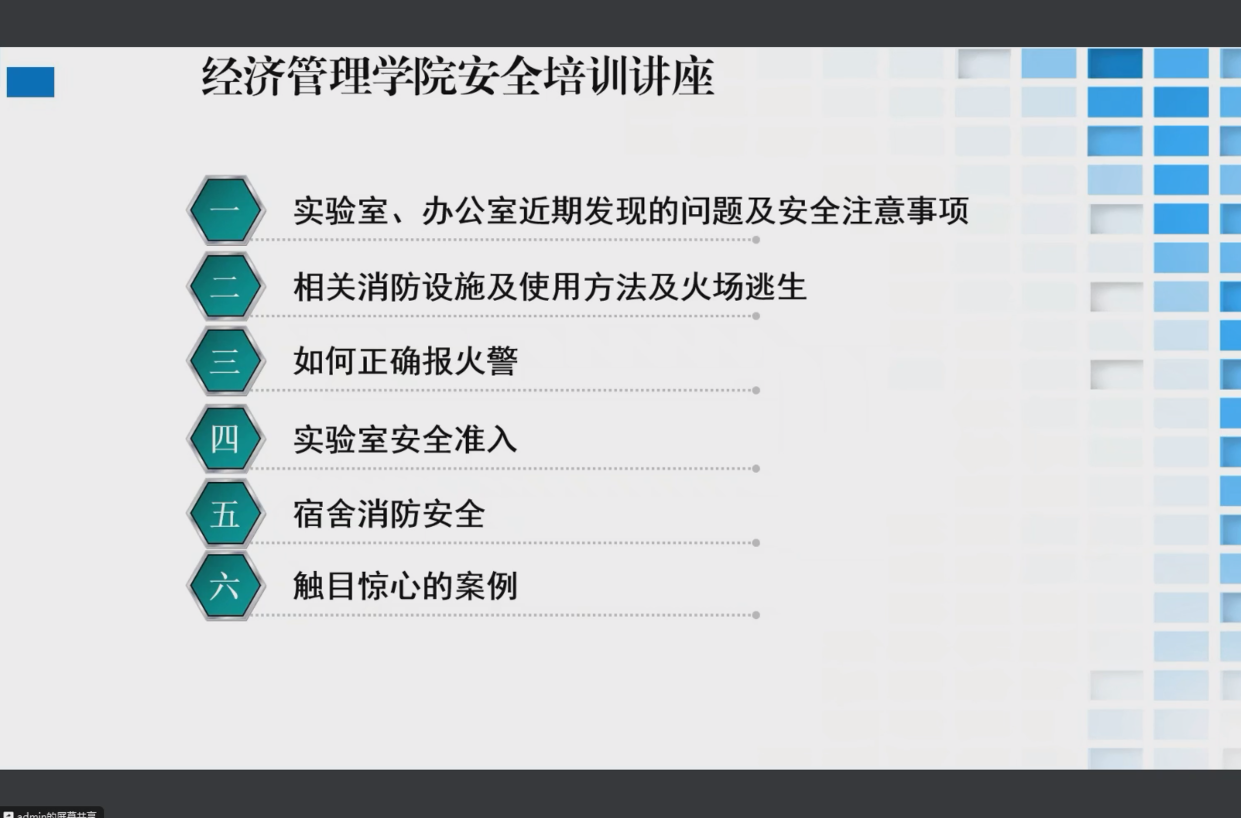 为进一步巩固师生消防安全意识及培养安全习惯,培育紧急逃生自护自救的能力,共建安全、稳定、和谐的校园环境,本着“安全第一,预防为主”和“以人为本”的理念,学院于2024年5月7日上午10点,通过在线腾讯会议形式为全院师生进行安全教育培训,此次培训由实验中心副主任曹明老师主讲。