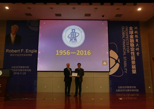 2016年11月23日,诺贝尔经济学奖获得者,美国国家科学院院士Robert F.Engle教授应邀访问beat365亚洲版官网,出席北航beat365亚洲版官网建院60周年纪念活动,并为北航经商大讲堂做首场学术报告:全球金融稳定性前景展望。报告会由beat365亚洲版官网副校长黄海军教授主持。