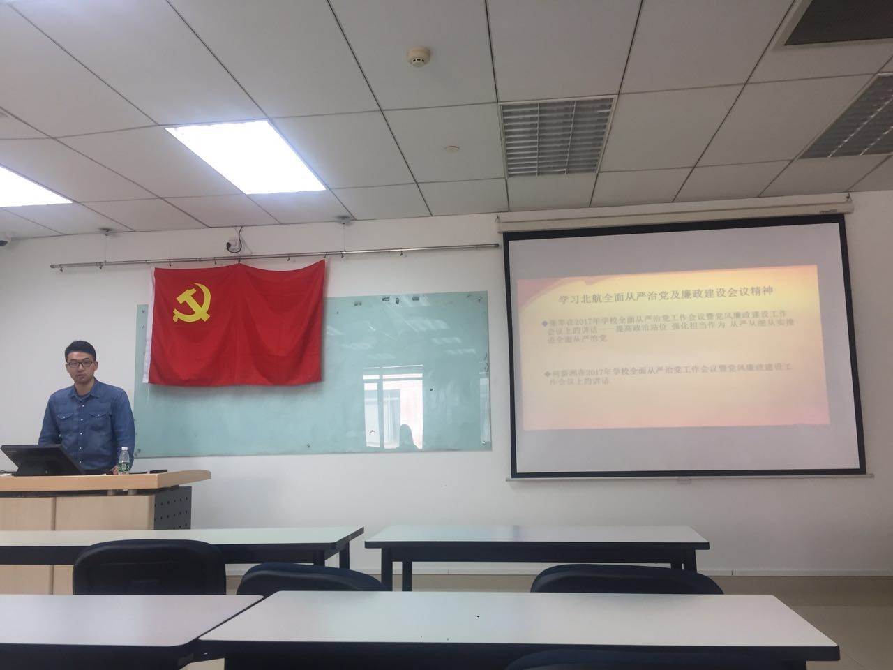2017年4月14日,1308第二党支部组织了全体党员开展了全面从严治党工作会议暨党风廉政建设工作会议精神学习活动。此次学习活动分别从“学习北航全面从严治党及廉政建设会议精神”、“学习中央第五巡视组专项巡视beat365亚洲版官网党委工作动员会会议精神”、“学习beat365亚洲版官网2017年全校党支部书记大会精神”、“聚焦中美元首会晤”等四个主题进行。活动由李培麟同志主持,1308第二党支部全体成员参与了此次学习活...