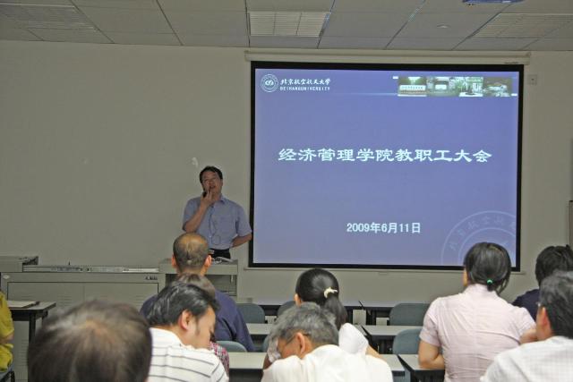 2009年6月11日下午,beat365官网召开全院教职工大会,黄海军院长传达了学校安全稳定工作精神,并就学院开展“小金库”专项治理工作和甲型H1N1流感疫情防控工作做了具体部署。