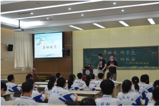2013年5月22日下午1:30,经管学院1008第一党支部16名党员、积极分子来到了北航附中初二四班,参加该班级的“文明校园”主题班会。